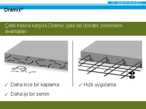 ZEMÝN BETONLARINDA DRAMIX® KULLANILARAK ÇELÝK HASIRA GÖRE, DAHA ÝYÝ BÝR BETON ZEMÝN ELDE EDÝLÝR, DAHA ÝNCE BETON ATILABÝLÝR, DONATI BETONUN BELÝRLÝ BÝR KISMINA DEÐÝL BÜTÜN BETON KESÝTÝNE DAÐILDIÐINDAN DAHA AZ ÇATLAMA RÝSKÝNE NEDEN OLUR, DERZLERDE HASIRIN KESÝLME GÝBÝ OLAN DEZAVANTAJINI YOK EDER, OLUÞABÝLEK ÇATLAKLAR HASIRDAKÝ GÝBÝ AÇILMAZ ÝNCE BÝR ÇÝZGÝ ÞEKLÝNDE KALIR,DARBELER SONUCU BETON YÜZEYÝNDEN PARÇA KOPMASI OLMAZ, BETONA ESNEKLÝK KAZANDIRIR.