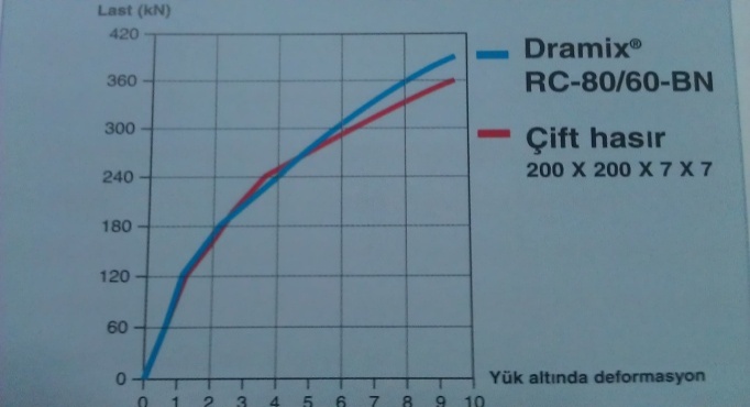 AÞAÐIDAKÝ ÞEKÝLDE DE ÇÝFT KAT HASIRA KARÞILIK DRAMIX PERFORMANSININ KARÞILAÞTIRILMASI GÖRÜLMEKTEDÝR. BURADAN DA ANLAÞILACAÐI GÝBÝ DRAMIX UYGULANAN BETONUN YÜK ALTINDAKÝ DEFORMASYONU DAHA BÜYÜK YÜKLERDE GERÇEKLEÞMEKTEDÝR.